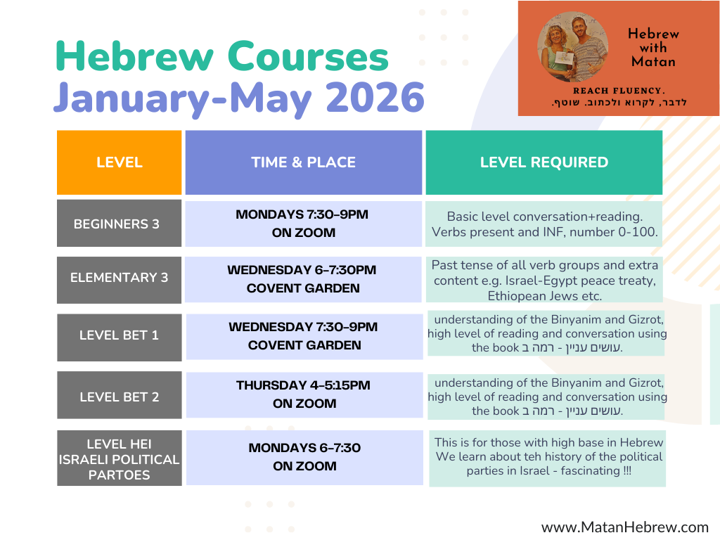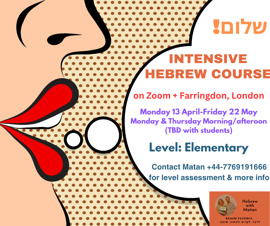 In the past, I have taught in many Hebrew schools, including Eteacher (Rosen Hebrew School), Ulpan Kibbutz and the acclaimed Ulpan Bayit in Tel Aviv. As well as the KCL and SOAS Languages Centres.